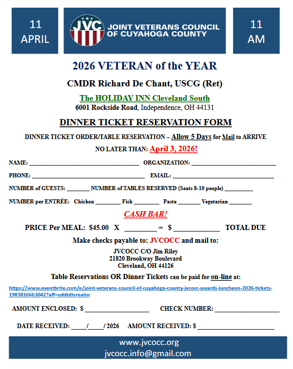 The JVCOCC will be honoring retired CMDR Richard De Chant, USCG. Luncheon will be held at the Holiday Inn, Independence Saturday April 11th 2026 starting at 11 am. Online registration for the event here, or use the Mail-In RSVP below. For questions please email jvcocc.info@gmail.com